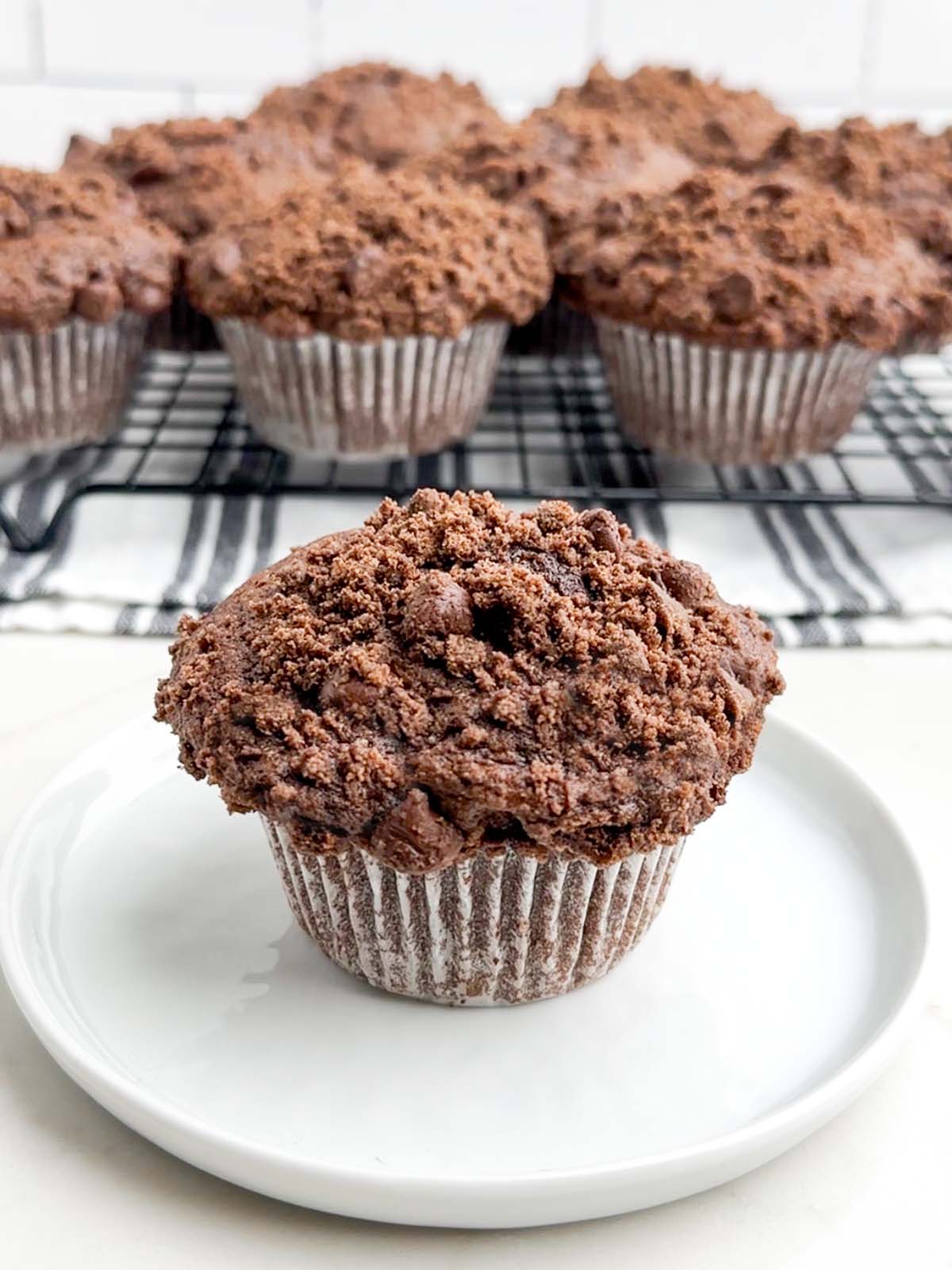- Scoop the batter into the 12 muffin cups, filling them to the top. Sprinkle the chocolate streusel topping on top of each muffin.