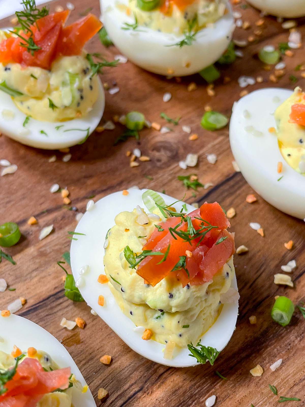 - Spoon yolk mixture into a small zip-top bag and snip off the corner. Pipe yolk mixture into the egg whites. Garnish with chopped smoked salmon, 1 teaspoon chopped fresh dill, 1 sliced green onion, and more everything bagel seasoning.