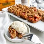 Rhubarb Oatmeal Bars are sweet and tart with a brown sugar oatmeal cookie crust, gooey fruit filling, and a buttery oatmeal crumble topping. This delicious cookie bar recipe comes together in minutes with fresh or frozen rhubarb.